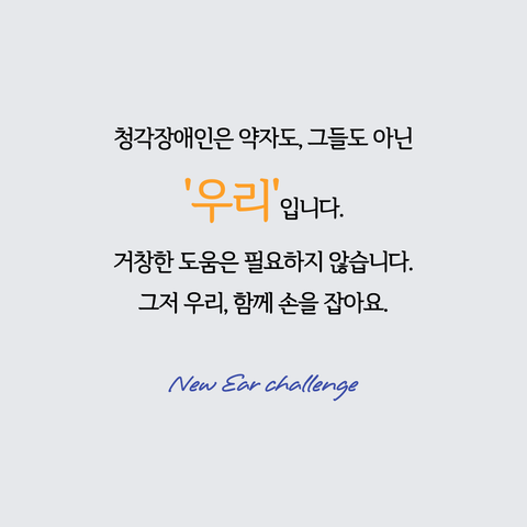 청각장애인은 약자도 그들도 아닌 ‘우리’입니다. 이를 깨달을 때 비로소 우리는 코로나라는 난관을 ‘함께’ 극복할 수 있을 것입니다. 거창한 도움은 필요하지 않습니다. 그저, 수어 교실을 향한 관심과 뉴이어 챌린지에의 참여로 손을 맞잡아 주시기를 부탁드립니다.
