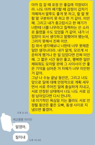 근데 이틀 전, 4일에 얘가 대학 문제(대학 문제는 나중에 다룰게) 때문에 나랑 전화로 얘기하다가 내가 얘한테