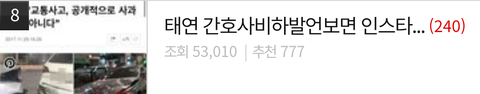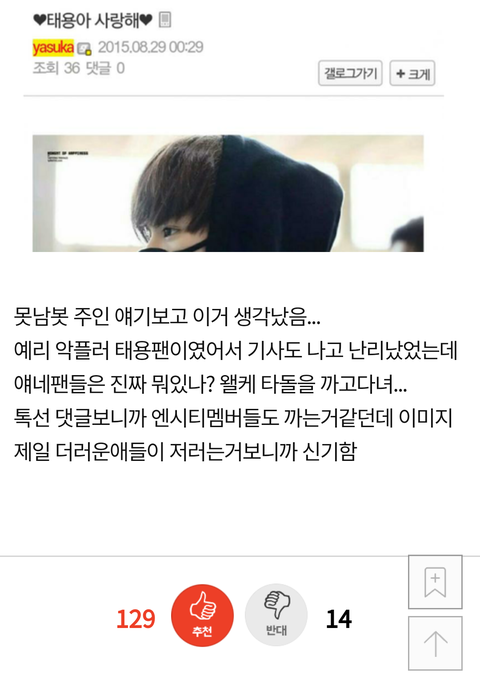 시티즌들 구라치고 앉아있노...? 아미들이 선시비 털어서 이렇게 됐다고 해가지고 처음부터 끝까지 댓글 다 찾아봤는데 먼저 머리채 잡힌게 아미들이던데 무슨소리 하는거? 엔시티즌들 갑자기 소환되서 이거저거 다 끌올되서 쳐맞는게 개빡친다는거 잘 알겠는데 사실은 정확히 말해야지 아미가 뭘 어쨌다는거야?