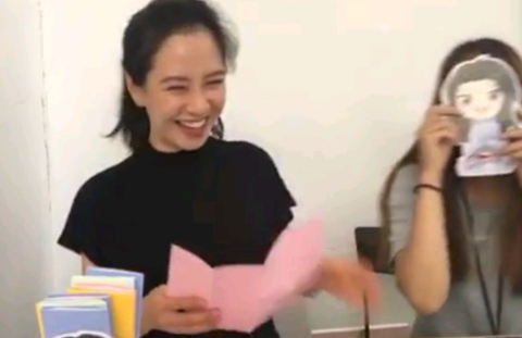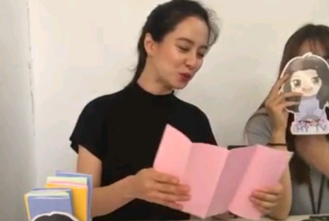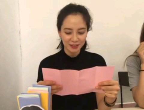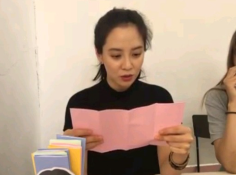 송지효가 그 중 한 개를 뽑아서 읽는 중