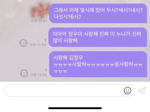 언니도 정프인데 언니도 버블 하거든 근데 갑자기 조카 설렜는지 내방와서 야 조카 설레 진짜 미친놈이야 아러면서 폰 가져가더니 답장 세개 다 써버림... 나 한개밖에 안썼는데.. 자기꺼 답장 3개로 지 마음을 표현하기에 부족했구나 라고 동정중임 사랑해 언니