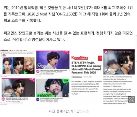 +) 지난 2019년 4월에 공개된 뷔의 '작은 것들을 위한 시' 입덕 직캠이 1억 3천만 스트리밍을 넘으며 역대 K팝 직캠 조회수 최고 기록을 자체 경신했다.