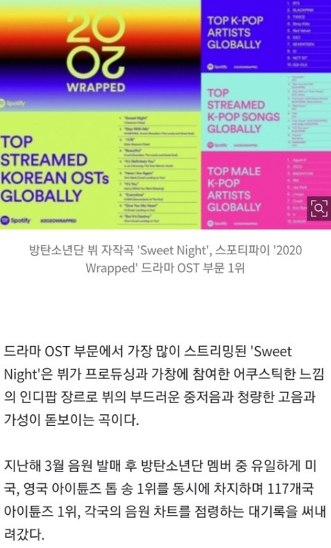 방탄소년단 뷔 자작곡 'Sweet Night', 스포티파이 '2020 Wrapped' 가장 많이 스트리밍된 드라마 OST 부문 1위