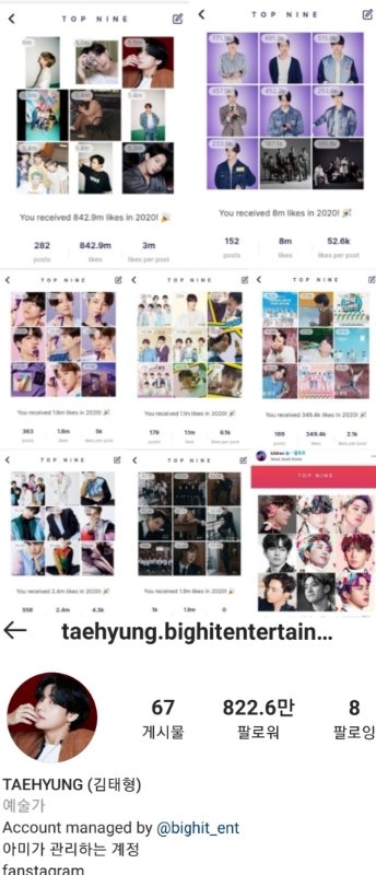 +) 뷔는 작년에 이어 올해도 많은 인스타그램 계정의 ‘베스트 9’에 선정되며 존재감을 각인시키고 있다. 특히 방탄소년단의 공식 인스타그램 계정에서 가장 많은 ‘좋아요’를 받은 ‘베스트 9’에서 1, 2, 3위를 싹쓸이하며 압도적인 존재감을 과시했다