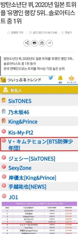 방탄소년단 뷔, 2020년 일본 트위플 '유명인 랭킹' 5위... 솔로아티스트 중 1위