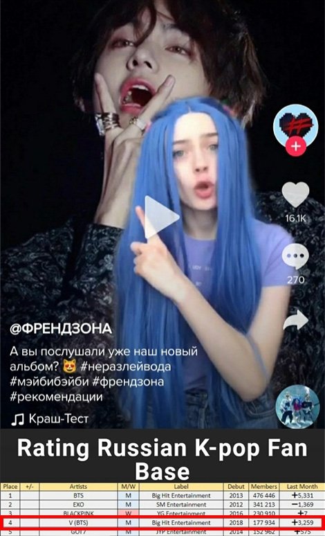 +) VK를 기반으로 활동하는 케이팝 최대 커뮤니티인 디어존(Deer Zone)은 케이팝 팬클럽 현황을 매월 발표하고 있다. 디어존 발표에 따르면 5월 현재, 팬클럽 수 1위는 방탄소년단으로 팬클럽 회원 수 약 48만에 달한다. 특히 멤버 뷔는 그룹, 개인을 총망라한 순위에서 회원 수 약 18만명으로 4위를 차지했다.
