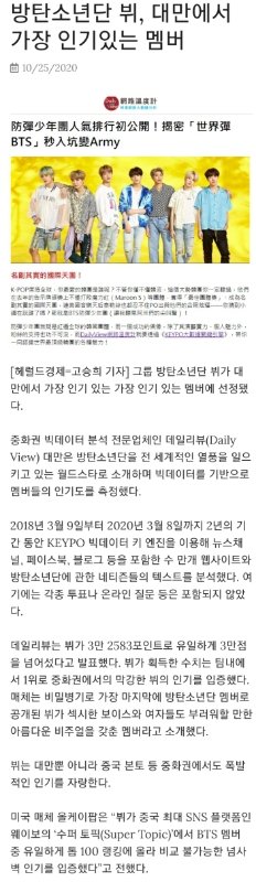방탄소년단 뷔, 中 최대 QQ 뮤직 '2020 K팝' 남자가수 최고순위.. 중국도 '태태랜드'