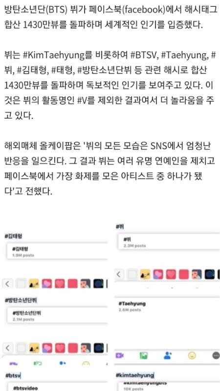 +) 페이스북은 10억 명의 이용자가 가입한 세계 최대의 소셜네트워크서비스로 방탄소년단은 #BTS 1100만, #방탄소년단 330만뷰로 K팝 그룹 중 최고 언급량을, 뷔는 연예인 중 가장 많은 해시태그 언급량을 가지게 됐다.