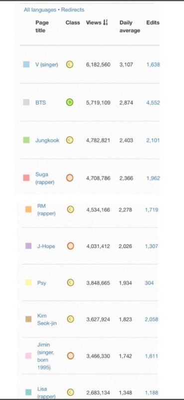 +) 위키피디아는 사용자 참여 형태의 온라인 백과사전으로, 방문자 수인 페이지뷰(Page view)는 빌보드 소셜차트(Social Chart)에도 데이터로 사용되는 공인된 소셜 인기지표 중 하나이다. 뷔는 위키피디아에 싱어송라이터 겸 배우로 등재되어 있으며, 2015년 7월~2020년 12월 12일까지 전세계 누적 페이지뷰 또한 1,486만건으로 최고 조회수를 기록했고, 가장 비중이 높은 영어권 페이지뷰도 620만회로 팀내 유일하게 600만회를 돌파했다.