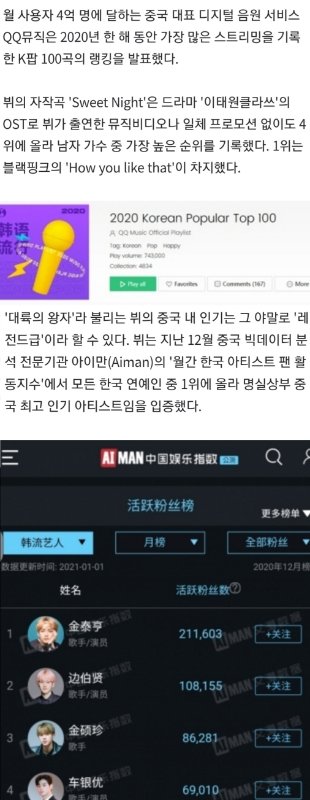 +) 중국 월간 아이만 지수 한국 아티스트 1위