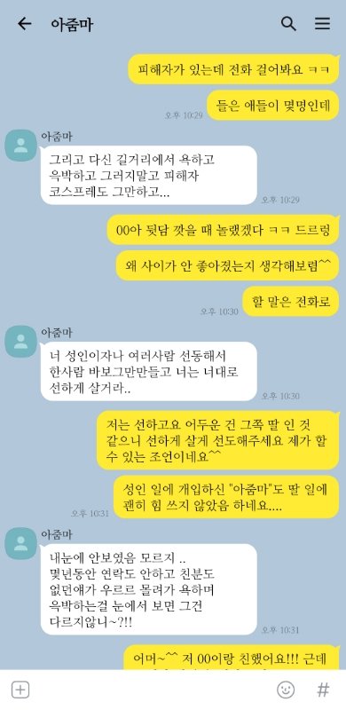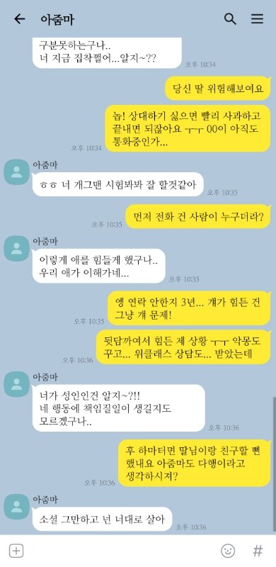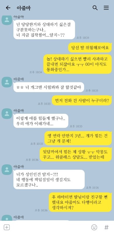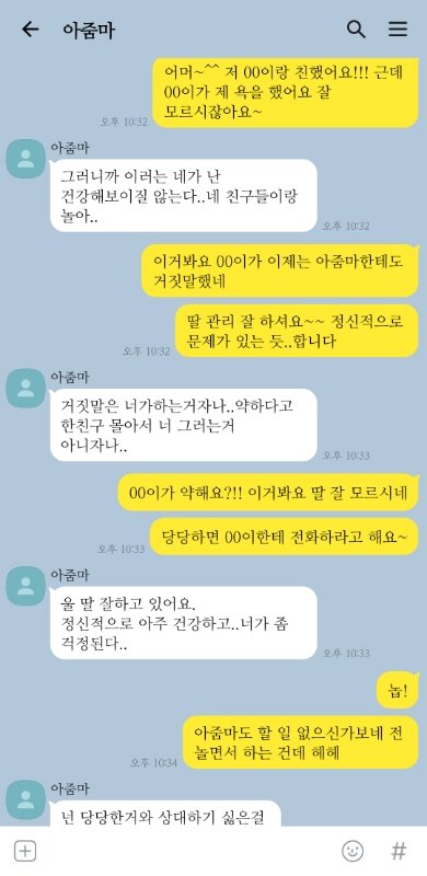전화로 왜 00이한테 왜 그랬냐 하시면서 제가 무슨 그 친구를 중학교때 따를 시키고 이간질하고 그랬다면서 엄청 뭐라고 하시더라구요. 이간질 당한거는 저인데 말이죠.