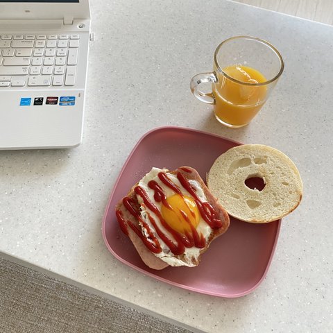 그래도 아점은 오렌지쥬스로~ㅎㅎ 냉장고에있는 베이글 구워서 스팸올리고 계란후라이.. 꿀맛 노른자반숙은역시..❤️