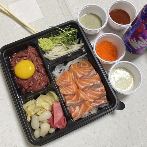 역시 회를 뺄수없죠ㅎㅎ 연어가 너무 먹고싶었어요 육회까지 세트가 있더라구요 바로 시켰습니다 호호