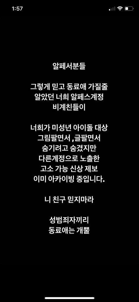 아이돌측에서 도움 필요없다고 하면 고소 진행 못함ㅋㅋㅋ 심바 알페스 쓴 2명은 고소가능하겟지만 특히 슴소속아이돌쪽은 고소진행 허락 절대 안해줄꺼니 슴덕들은 초조해하지마셈