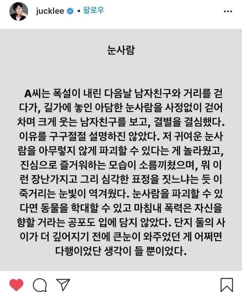 대충 만들고 내버린 눈덩이 정도라면 차든 밟든 신경 안 쓰지만 눈사람이라는 존재 자체가 누군가의 시간과 정성이 들어간 사물이고 거기엔 그 사람들의 추억도 깃들어있을 텐데 그걸 발로 찬다? 걍 공감능력 다 뒤진 ㅅㄲ같음 정떨어져서 바로 이별각재고 있을 거임