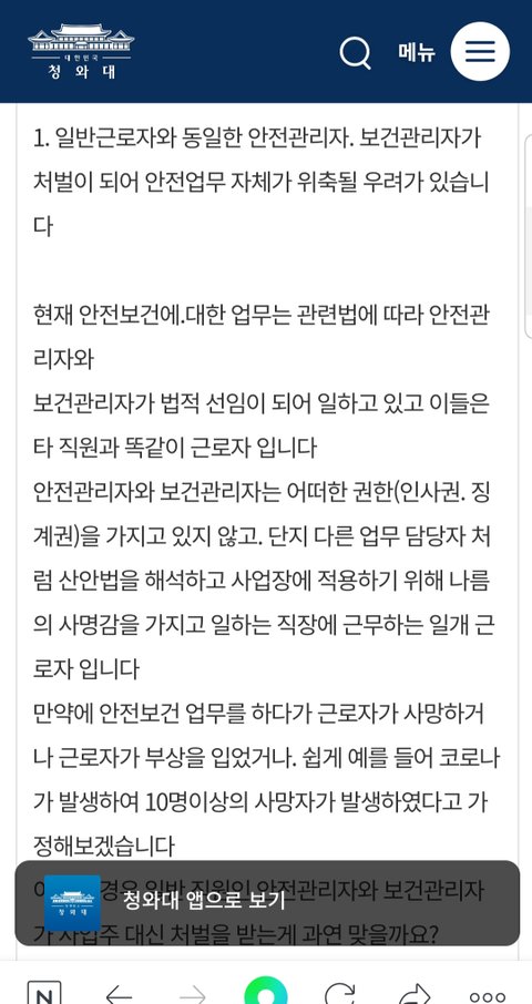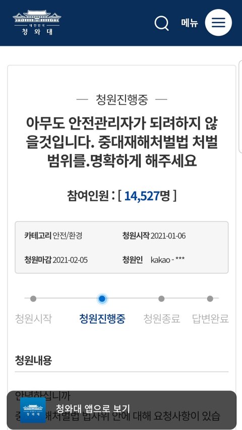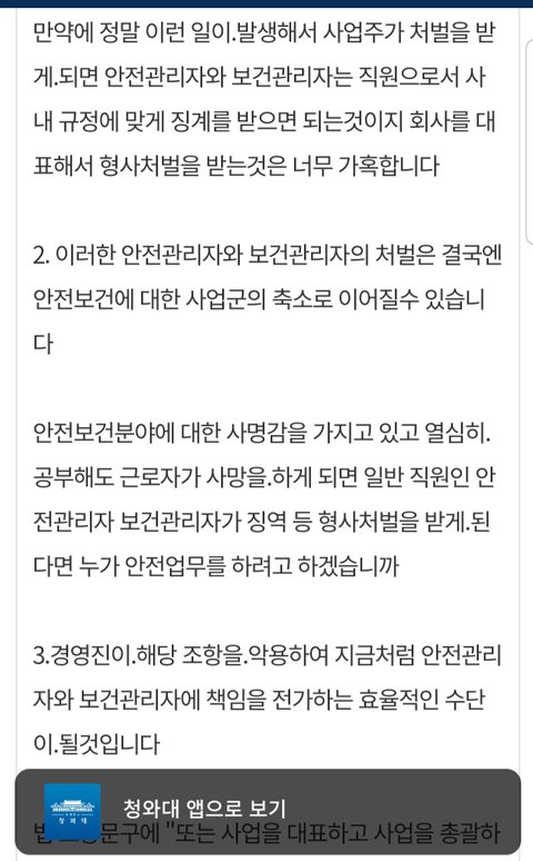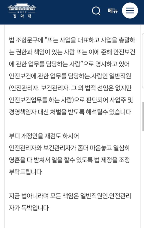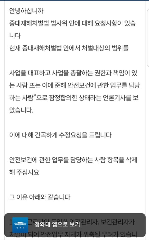 안전관리자는 어느 직원과 마찬가지로 회사의 한 직원일 뿐입니다. 이 법안에 대해서 다들 청원 한번씩 부탁 드립니다.