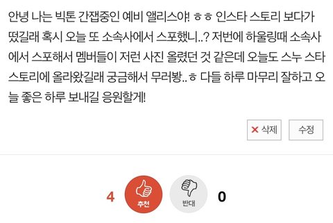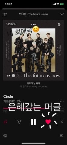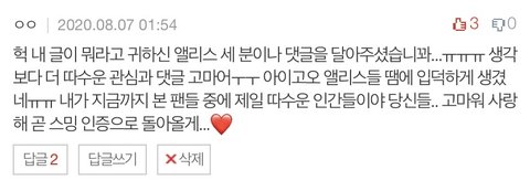 안농 기억할랑가 모르겠지만 저번에 궁금한거 물어봤다가 따뜻한 앨리스의 관심에 스밍 약속을 했었는데 이제서야 스밍인증 약속 지키러와쏘~ 다들 한파 조심하궁 코로나 조심해!! 이번 정규앨범 빅톤 앨리스 화이팅! +(아직 나는 입덕 부정기이지만 캄백쇼보면서 광대 아파서 죽는 줄 알았어... 빅톤 대유잼인거 세상 사람들 다 알았으몀 좋겠다