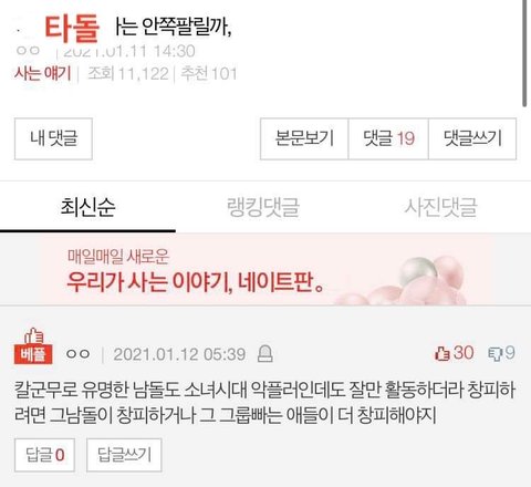 ㅇㄴ 솔직히 우리만 병크있냐. 우리만 맨날 끌올돼서 ㅈㄹ이야. 우리는 영업글은 고사하고 댓글에 사진 다는것도 최근에 겨우 시작했는데 ㅅㅂ 누가봐도 까려는 글(타그룹이지만)에 까려고 쓴 댓글ㅋㅋㅋ 솔직히 판 이중잣대 ㅈㄴ 심하다고 생각함. 병크 있어도 누구한테는 찬양 해 주고 영업글 써도 뭐라 하는 사람 거의 없고 주기적으로 끌올 글 써지지도 않고... 처음에 우리가 사렸더니(이 행동을 뭐라 하는건 아님) 우리만 ㅈㄴ 만만하게 보고 계속 건들이는건가라는 생각도 들게 됨. 솔직히 판 우리한테만 ㅈㄴ 야박한건 맞지 않냐(걍 내 생각) 비슷한 병크, 더 심한 병크 있는 누구는 쉴드치고 올려치고 누구는 죽을 듯이 욕하고. 우리 전에 그 글 없었으면 또 끌올 글 올라오고 댓글도 못 썼을껄. 지금도 ㅇㅇ사진만 달면 한두명씩 꼭 와서 얘 병크 끌올하는데 지금 병크 있는 아이돌 중에서 이렇게까지 댓글마다 와가지고 병크 끌올되는 아이돌 한명 빼고는 못 봄ㅋㅋㅋ