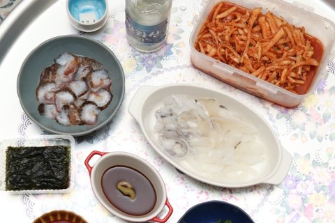 홍해삼,무늬오징어회에 한라산 한잔!!