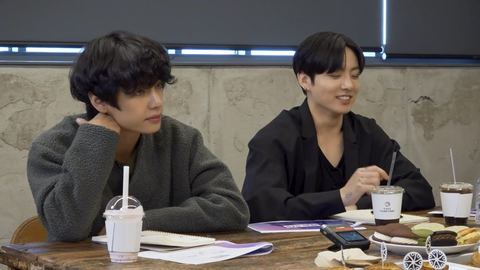 뷔는 아메리카노 마시게 생겨선 딸기라뗀가 달달한거 마시고 정국이는 달달한거 마시게 생겨선 아메리카노 ㅋㅋㅋ