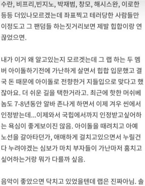 우리가 언제 국힙에서 인정 받고싶어했지? 지금 방탄이 서있는 이자리가 애매하게 걸친 자린가? 지가 뭔데 민윤기랑 김남준 랩을 개보듯이 하지? 우리가 지금 국힙러들한테 패인것만 얼만데 ㅋㅋㅋㅋㅋ 우리가 이유없이 저사람들한테 저랬나? 분명히 오해의 소지가 있었는데? 비프리는 분명 슈가랑 알엠한테 무례했었고 창모도 가사 적어놓은게 오해할만했고 아이돌이 그렇게 국힙 니들한테 까일 자리야? ㅋㅋㅋㅋㅋㅋ 아이돌 조카 무시하네