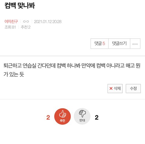 나는 그냥 악의적인 의도 없이 인스타 스토리랑 몇몇 글 보면서 컴백인 것 같다라고 추측해서 올린건데 기분 나쁠 줄은 몰랐다 ㅜㅜ 미안해 ㅜㅜ 글은 지웠어 ㅜㅜ