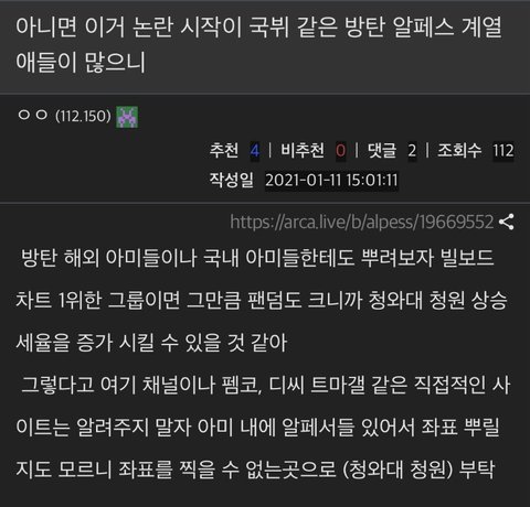 꼴에 방탄 팬덤 크니까 거기 기어들어가려한것같고 걔네말론 방탄 해외팬들한테 방탄 알페스 심각성 알리겠다는데 방탄 해외팬들 개무시할듯 애초에 국뷔 해외판 졸라큰데 ㅈㄴ 병신같음 일을 꾸밀땐 시장조사부터하자