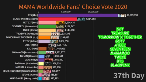 방탄은 논외로 월드클래스라서 빼고 ㅋㅋㅋ중간에 대체 뭐임...? 심지어 팬덤 개쎄고 투표 쟁쟁한 세븐틴이랑 엔시티 위네 .. 남돌이야뭐얔ㅋㅋㅋ 투표 개쩌네 트와이스도 대단하고.. 아니근데 트레저는 신인아님??