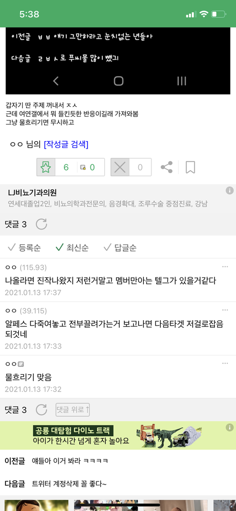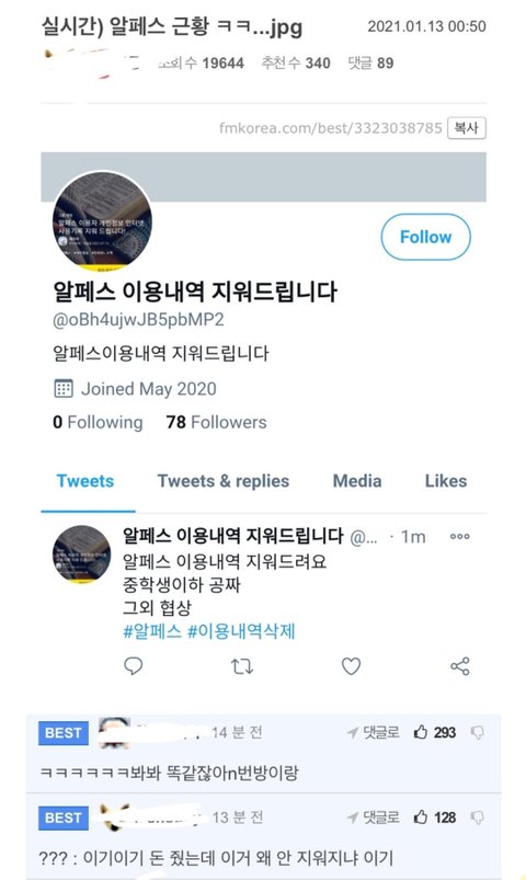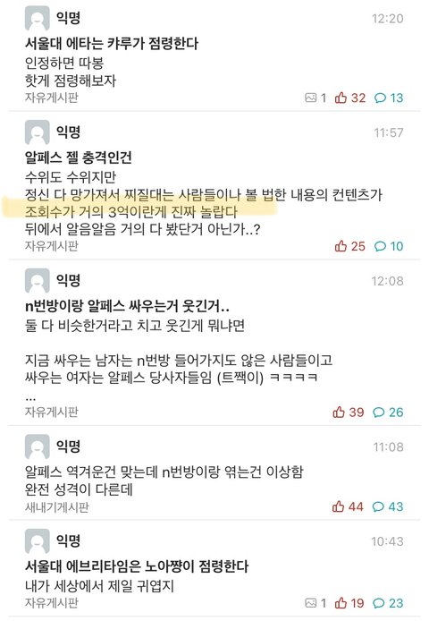 응... 나도 알페스 안먹고 수위쎈 그림같은거 진짜 싫어하는데 이건 지금 그냥 여자들한테 성범죄자 프레임 씌우려고 하는거 확실해짐ㅋㅋㅋㅋㅋㅋ 남돌인권엔 ㅈ도관심없음ㅋㅋㅋㅋㅋㅋㅋㅋ 이루다 막혀서 빡친거 한녀한테 푸는중 ㅜㅋㅋㅋㅋㅋㅋㅋㅋ