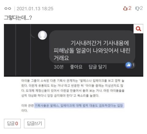 소속사가 알페스 기사가 써지는 게 싫어서 내린 게 아니라 기사 내용에 남돌 얼굴 나와있어서 내린 거라는데 진짜야...? 뭐가 맞는지 알려줘