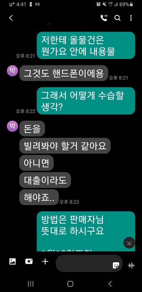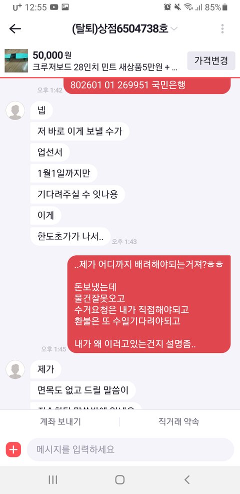 그러더니만 자기가 일도 그만뒀고(판매할때 택배사에 근무한다더니 갑자기 관뒀나봐요) 돈이 없는데 구직도 안되서 돈을 3월이 될지 언제가 될지 모르겠다는 뻘소릴하는거에요. 말같지도 않은 소릴 이어가길래 1월 10일까지 약 보름간 시간드릴테니 80을 마련해서 보내달라고 했습니다. 그 이후론 조치를 취하겠다고 했어요.