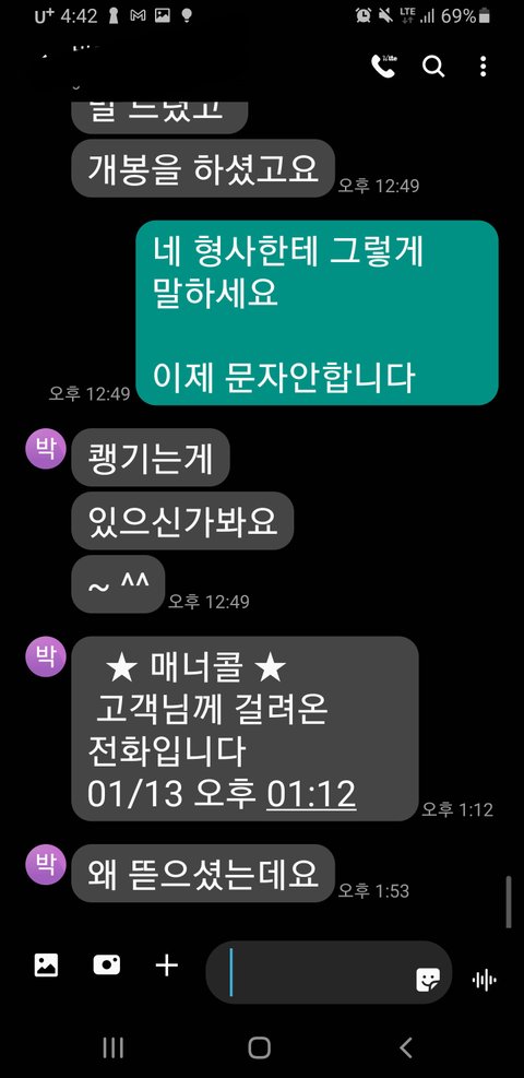 사실 문자보면 또 아무맥락없이 왜 뜯었냐며 반복해서 문자를 남깁니다. 누군가 문자내용을 증거로써 보게 될경우를 대비한다는 생각인지, 자신은 뜯지않았다는것을 어필하려는 심리가 완전 드러납니다.. 결백한 저는 오히려 헛소리를 상대하기 싫어서 당신과 할말없고 경찰에 말하겠다고만 문자를 보내구요.