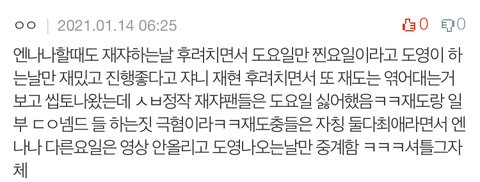 아 ㄹㅇ ㅠ 맨날 엔나나 후려쳐놓고 고정게스트되니까 도요일이란 말 만들어내고 도요일만 들을만해 ㅇㅈㄹ 하고 여초에도 정치질하다 걸리고 그래놓고 재도로는 하나하나 말만 주고받아도 다 엮어서 먹고 쟌 없는 사람취급함 미친 재도충들; 없는 사람취급이면 다행이게 사랑방해꾼 취급함