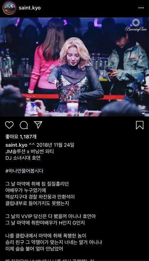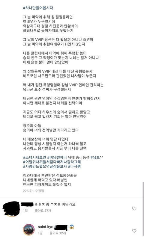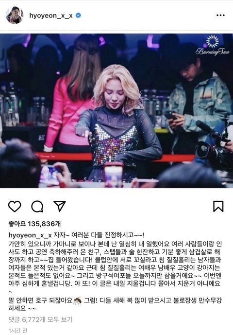 + 그냥 난 저 사람 인스타에 효연 사진과 함께 버닝썬 이야기가 올라온게 단순히 궁금해서 제목을 저렇게 달았던건데 갑자기 톡선 올라온거임. 오해 하지 않았으면 함.