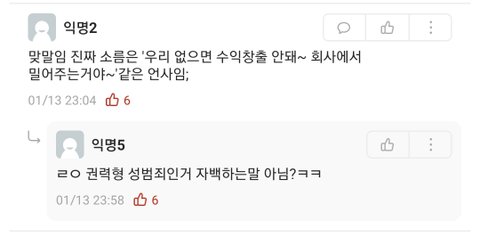 어 그리고 소속사에서 고소안하니까 괜찮다는말도 어이없음 솔직히 옛날 수위팬픽 시절부터 해서 지금까지 이어져 내려오는거 자체가 기괴한거임 처음 등장했을 때 개쳐맞고 사라졌어야 했을 문화야 윤리적으로는ㅇㅇ 실존인물가지고 뭐하는짓거리들이냐고ㅋㅋㅋㅋㅋ 그리고 지금 다들 2차창작물 위주로만 얘기하는데 난 트위터에서 1차 소비하는애들도 ㅆ극혐임 영상 짜집기해서 올리고 지들끼리 사귀네.키스했네. 했네 ㅇㅈㄹ하는거 개싫어 조카 토나와