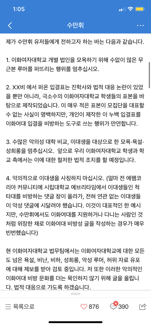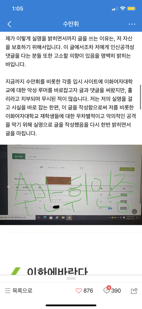 저번에는 외대욨는데 이번엔 이대인가바 저번에 판에 외대글에서도 이대언급 엄청 많더니 이대생이 실명 까고 수만휘에 직접 글 올림 난리났너.. 캡처 올려도 되는진 모르겠는데 가입 안된애등도 보라고 캡본 올림 진짜 수만휘같은 거대 입시사이트가 특정 대학교에 악감정 가져도 되는거야?? 앞으로 입시사이트 어디 쓰노... 중딩때부터 수만휘 개많이했는데 ㅜ