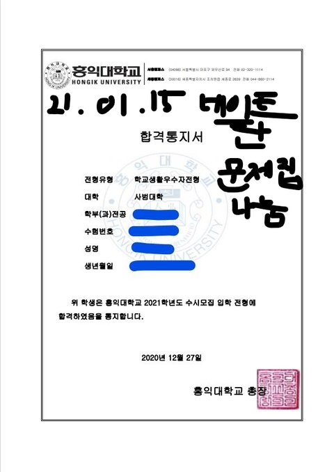 다들 나 응원해줘서 그런가 ㅎㅎㅎ 홍익대학교 합격했다!!!