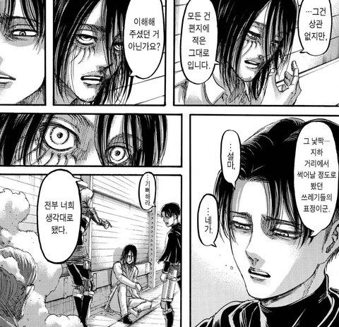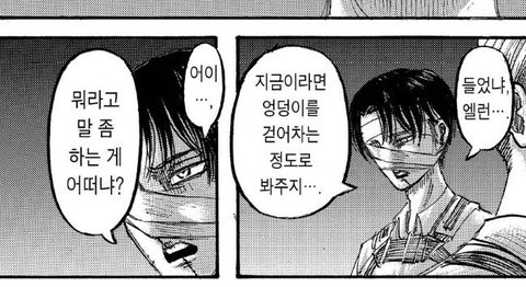 이 지경이 다 되었는데 할 말이 많다는 리바이... 찬탈자 엘런을 바보라는 귀여운 호칭으로 부르는 사람은 리바이 밖에 없을듯 대체 할 말이 뭘까... 아 넘 좋아