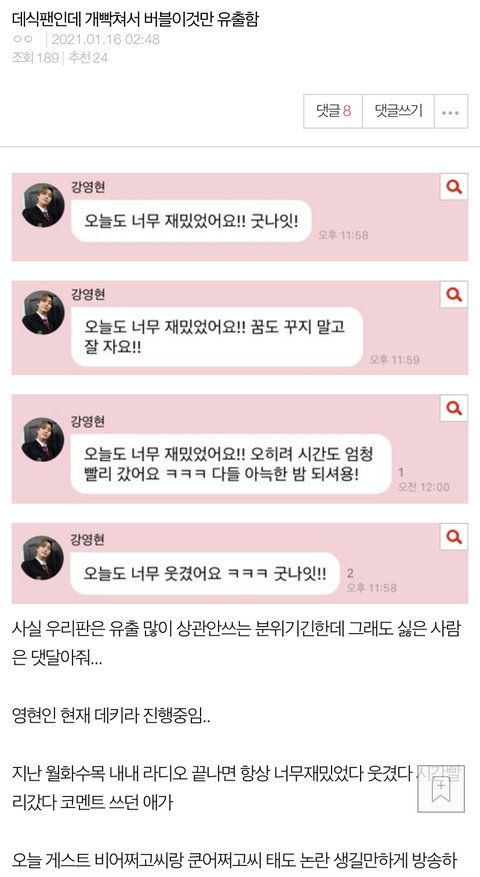 마이데이들은 알걸 영현이가 얼마나 대단한 사람이고 얼마나 잘난 사람인데 하루하루 넘치도록 열심히 사는앤데...전혀 그런 취급 받을 사람이 아님 그래도 영현이가 대처 참 잘해준거같음 본인도 기분나빠하지 않고 어른스럽게 대처한거같아 아기고양이 짱❤️