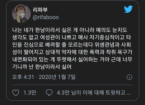 그냥 여잘 혐오하고 싶어서 어거지 소리 하면서 이유를 억지로 만들고 있는데상종도 하기 싫더라고요.