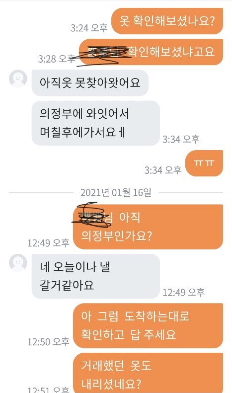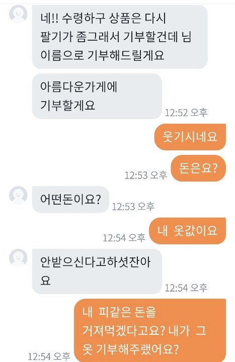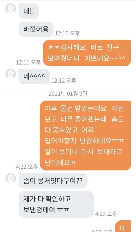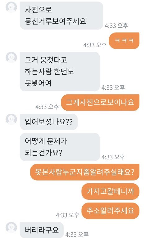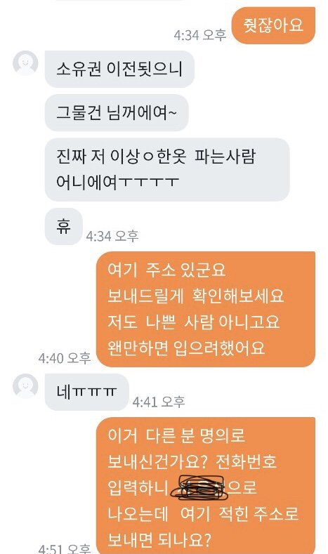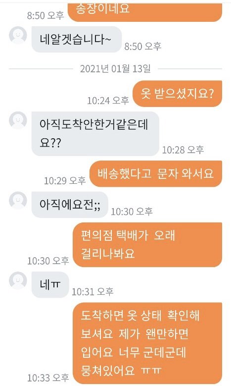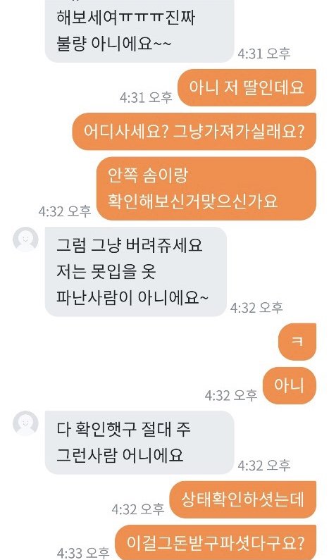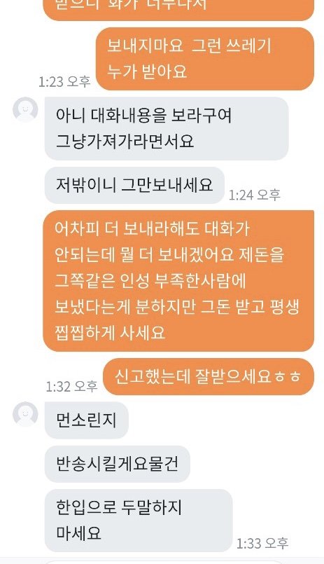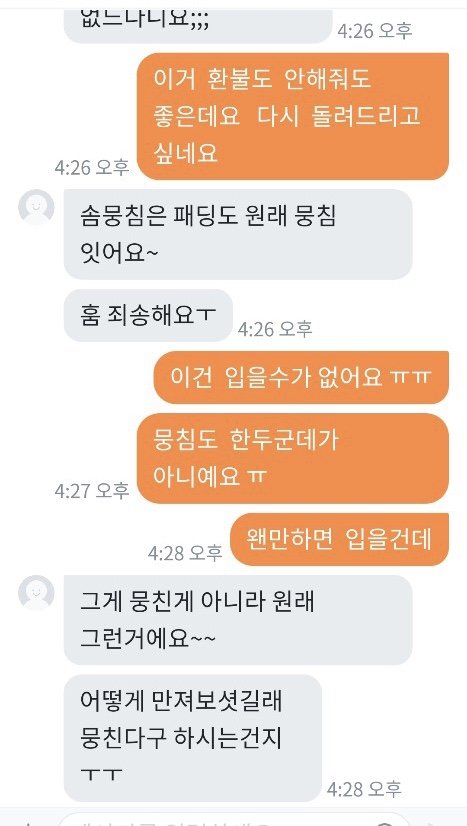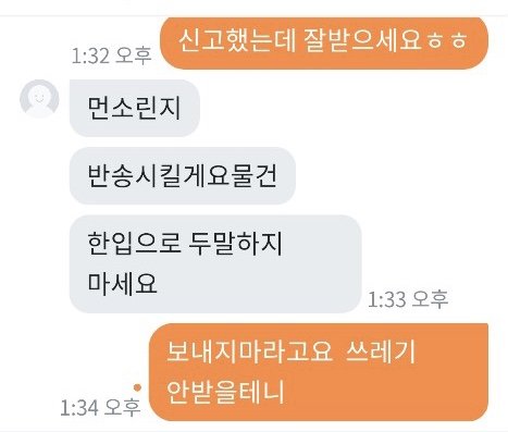 패딩을 다 다른 곳에서 총 3가지 구입했는데 2개는 너무 예쁜게 잘 왔어요 그런데 제일 비싸게 줬던 패딩 하나가 안에 솜이 곰돌이 인형 귀에서 조금 빼서 넣어놓은 것처럼 위에서 바닥이 느껴지고 옷이 너무 입을 수 없이 심각했습니다...핫팩도 넣어서 보내셨던데 오래되어 딱딱해서 쓸 수 없는 핫팩이 왔더라구요.. 가격대가 있던 제품이어서 엄마가 기대를 많이 하고 있었는데 진짜 판매할 수 없었던 물건 이였어요..엄마랑 저랑 입을 수 없다고 하니 버리라고 하더라구요..너무 화나서 필요 없다하고 다시 포장하고 착불로 보냈습니다 와중에 엄마는 그래도 너무 나쁘게 하기싫다고 돈주고 보내자했는데 제가 너무 답답한 마음에 착불로 했어요ㅠㅠ 엄마가 작은 돈을 준게 아니라서 계속 도착했냐고 봤냐고 몇일간 보냈는데 안왔다고 다른지역이라고 하더니 오늘 엄마아이디로 어디냐보니까 의정부라고 하고 제 아이디로 어디냐 보내니 부천이라고 하더라구요 착불이라 일부러 안찾아가는거 같긴했지만 이런 사람 처음 겪어봐서 엄마도 저도 속이 많이 상했어요 엄마한테 치매걸렸냐고 하고 사기 신고 하려했더니 반송하신대요 차단했는데 그 옷 저희집으로 배송오면 너무 화날거같아요 솔직히 저희는 양심이 있었으면 돈을 반이라도 돌려주거나 사과를 원했지만 있는 장소도 속이고 물건도 속이고 양심도 없는 사람 때문에 좋은 분들도 많은데 이런 분 때문에 몇주를 속상하게 보내고 있어 답답한 마음에 올려봅니다