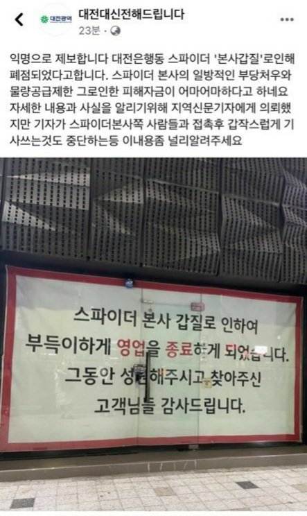 스파이더라는 브랜드를 좋아하고 구입도 많이 햇는데 이런 갑질을 벌이다니 너무 소름 끼치는 브랜드네요!! 매장 운영하셨던 사장님 힘내시고 정의는 살아있다는걸 꼭!!! 보여주셔서 스파이더 브랜드 참교육 부탁드립니다. 앞으로는 스파이더 사입을일도 없을없을겁니다~