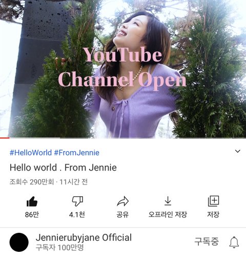 기존에 제일 빨리 구독자 100만 돌파한 채널이 하루였는데 제니가 11시간 10분으로 그 기록 깸