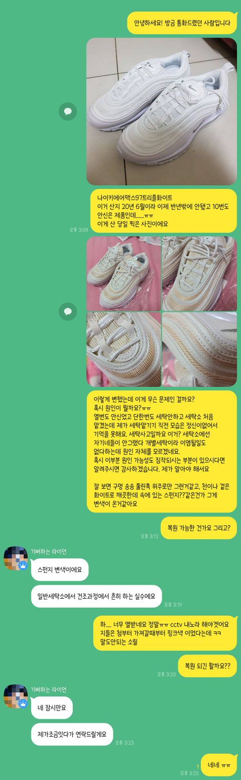 이거 세탁소에서 운동화세탁시 색이 변질되어 이렇게 될수도 있는 건가요?? 세탁소 측에서는 세탁물에 번호표가 다 달려있어서 세탁물이 바뀔 일도 없고, 그 신발이 무조건 제것이 맞으며 운동화 단독세탁이라 이염될 일도 없고 운동화는 세탁사고 자체가 날수가 없다고 합니다.