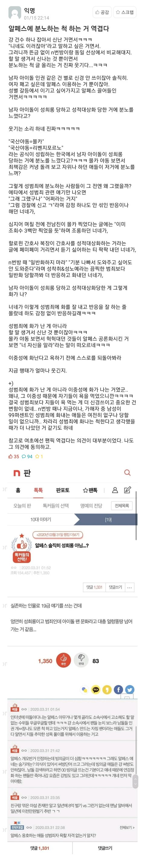 알페스 무조건 잘못이고 성희롱인데 여돌 직캠 느리게하고 그런거 싫다는 여돌기사에 배불렀네 어쩌고하던애들이 뭐?남돌알페스?ㅁㅊ년들! 하고있을거 생각하면 웃기긴해