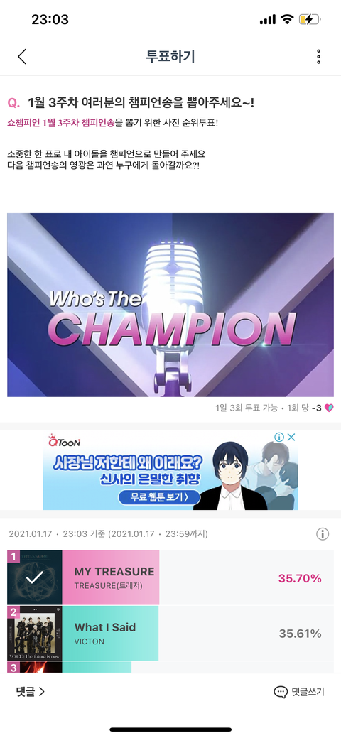 우리 첫정규잖아... 나1등 한번 먹여주고싶어...안한 트메들 지금이라도 해!!! 늦지않았어!! 12시에끝나거든!! 꼭해줘