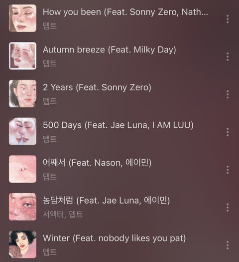 그리고 뎁트님 노래는ㅜㅜ 다 앨범 표지가 너무 예쁨..ㅠㅜ how you been이랑 최근에 나온 winter도 좋으니까 꼭 들어보길