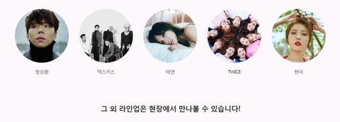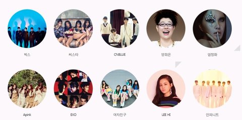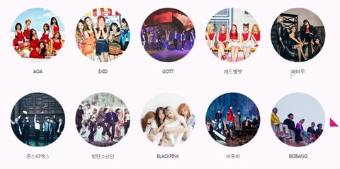 엑소, 샤이니, 방탄소년단, GOT7, 러블리즈, 레드벨벳, 마마무, 블랙핑크, 비투비, 빅스, 세븐틴, 씨앤블루, 씨스타, 여자친구, AOA, 에이핑크, 에일리, NCT, EXID, 인피니트, 트와이스