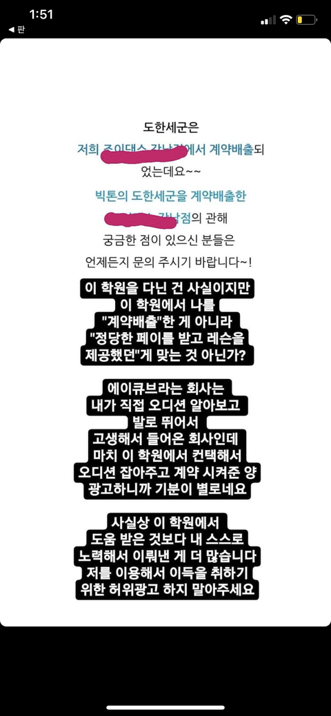 한세 뿐만 아니라 다른 아이돌분들 이용해서 마케팅하던데 마케팅을 할거면 학원 전체가 아닌 학원 어느 부분을 다녔었는데 데뷔를 하게 되었더라 이렇게 말해야 허지 않냐...? 그리고 한세가 말했듯이 한세가 직접 발로 뛰어서 얻은 성과인데 마치 자기들이 해줬다는 듯이 말하는데 아이돌이자 당사자 입장에서는 진짜 어이 없을 듯..한세 뿐만 아니라 다른 분들도 근데 저 학원 약간 그 마인드도 았는 듯 우리가 교육해서 지금 빅톤 도한세가 잘된거다 이런 마인드도 있는 것 같음 데뷔 하기 전에 한번 올리고 정규로 컴백한 시점에 올린 거 보면