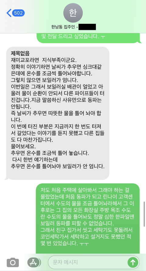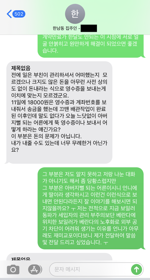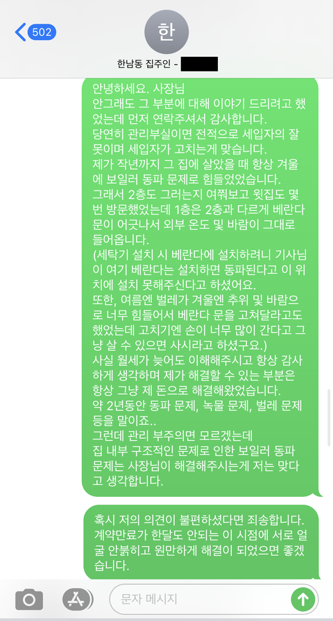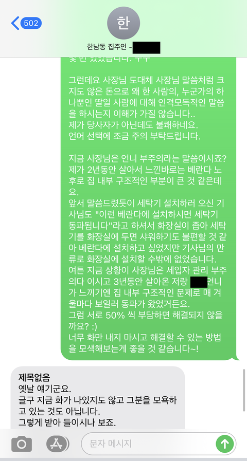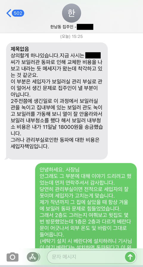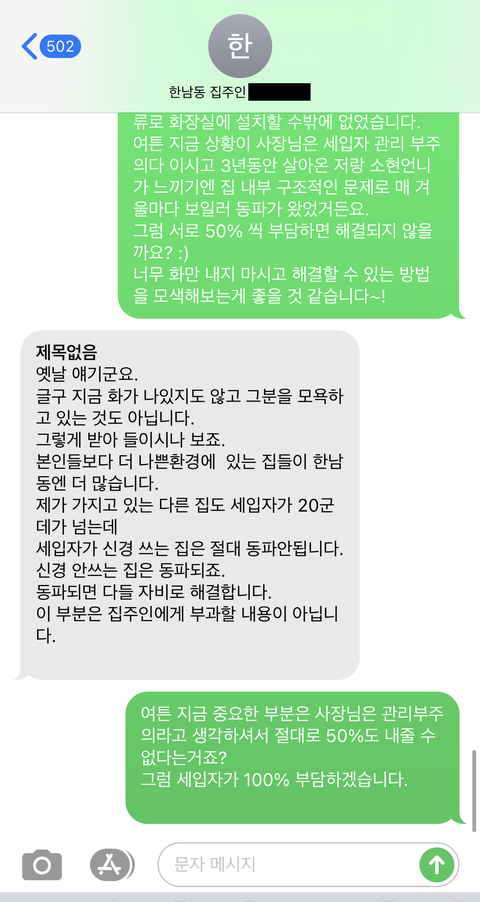 사실 집주인이 온전히 돈을 내기보단 50:50 으로 내는쪽으로 가고싶었고 별일 아니라서 그냥 메세지를 서로 오가고 있었는데